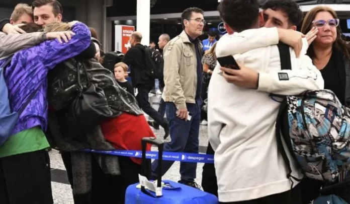 Tras los trámites migratorios y la recolección de equipajes, los pasajeros fueron trasladados en micro hasta la zona del hangar 5 de Aerolíneas Argentinas, donde los esperaban familiares y allegados.