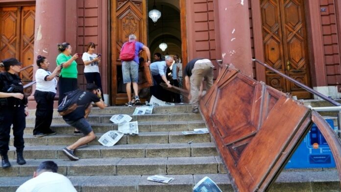 En el marco de la marcha organizada por la delegación local del Sindicato Unidos Portuarios Argentinos (Supa) manifestantes irrumpieron en el Palacio de los Leones